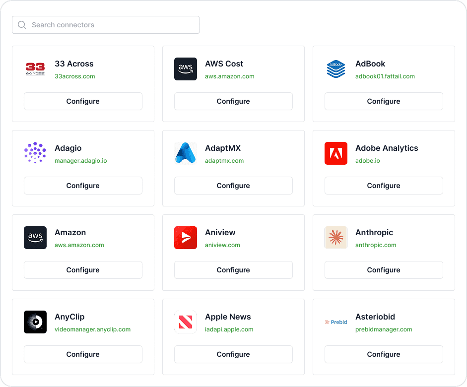Pull granular data from your full ad tech stack—GAM, SSPs, wrappers, analytics platforms. 200+ pre-built API connections and custom scrapers included.